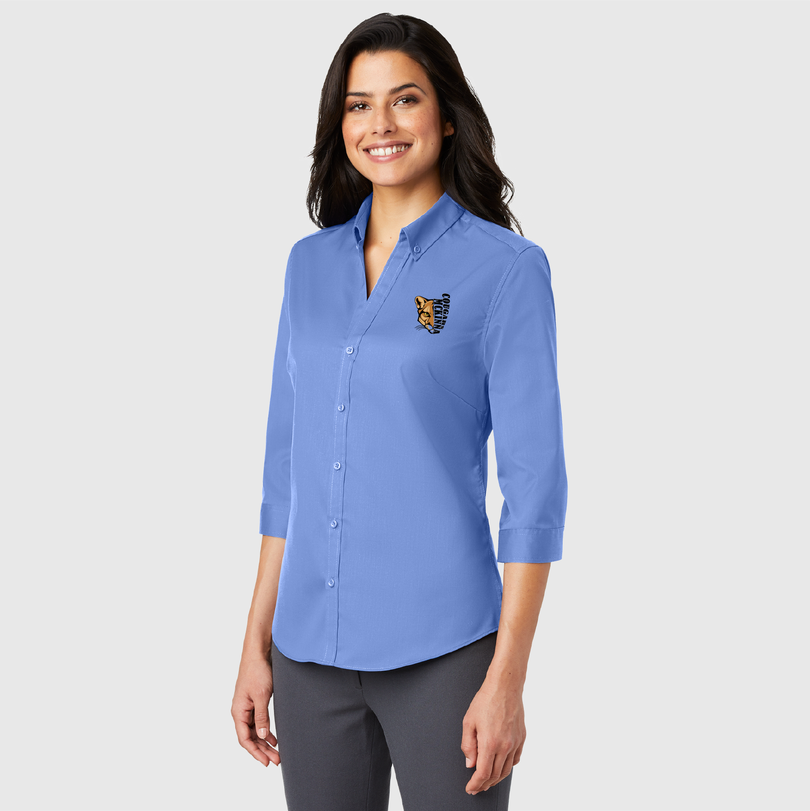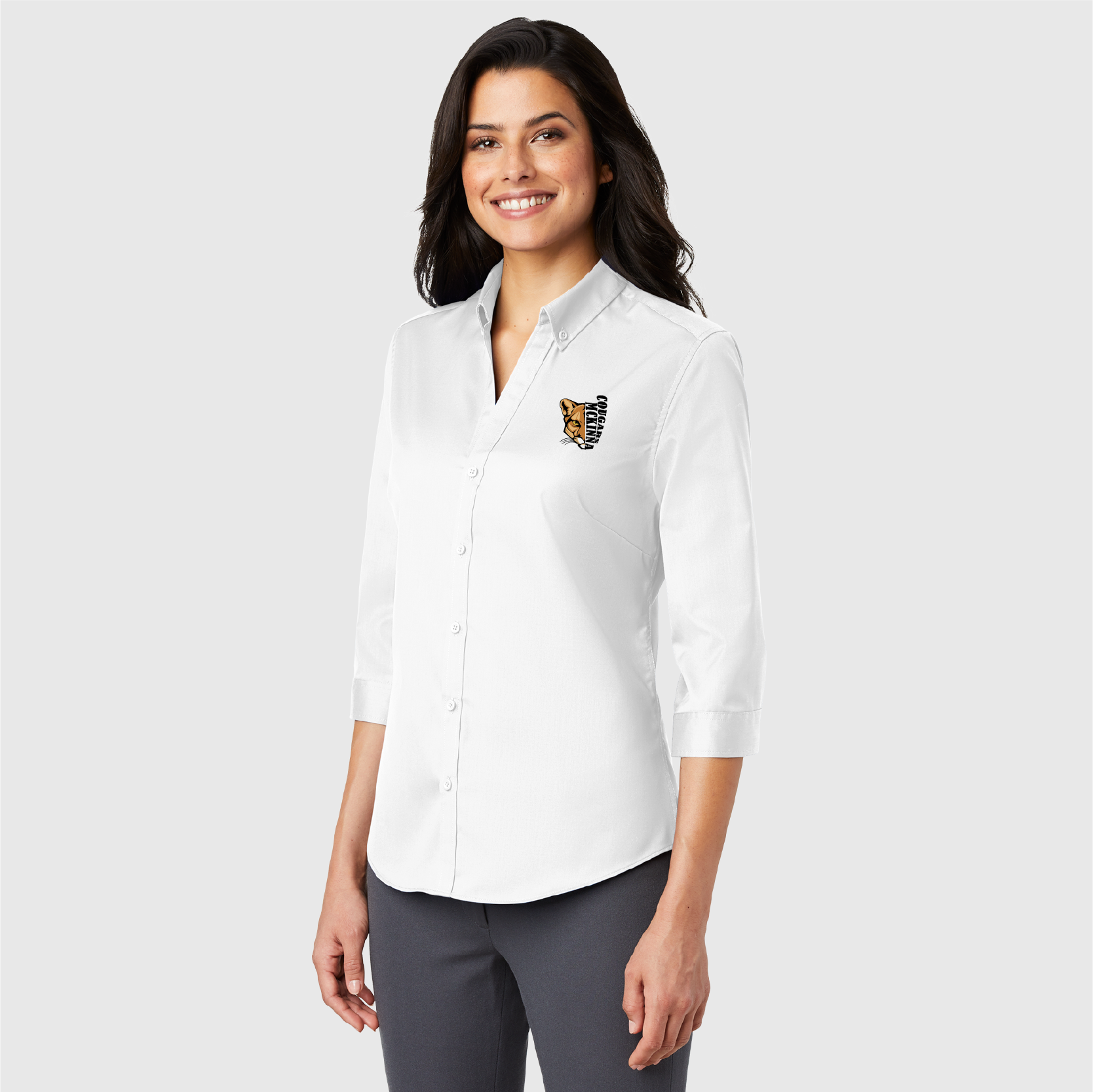 - Button-down collar with open neckline